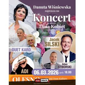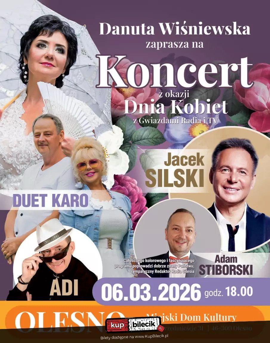 Duet Karo, który odnosi sukcesy w radiowych listach przebojów (m.in. kilka lat temu zdobył również "Diamencik" Śląskiej Listy Przebojów Radia Piekary) oraz Liście Śląskich Szlagierów telewizji TVS (3-krotnie ich piosenki zostawały przebojem roku - w latach 2008-2010, ponadto duet zdobył nagrodę dla Artysty oraz Teledysku 2010 roku, kolejne wyróżnienie pojawiło się za 2016 rok), w której największy sukces odniosła piosenka "Kochosz mie czy niy". Ich teledyski często też pojawiają się w telewizyjnych koncertach życzeń oraz na listach przebojów (w tym w TVS czy na LSS Szlagierowo oraz w radiach). Adi - od kilkudziesięciu lat na scenie muzycznej! Swoją karierę muzyczną zaczynał w lata 80-tych.. Na swoim koncie ma 2 płyty solowe! Wraz ze swoim nierozłącznym "kompanem" AKORDEONEM, rozbawi publiczność naszego wspólnego wieczoru! Koncert poprowadzi dobrze znany Państwu Prezenter Radia Silesia z genialnym poczuciem humoru: Adam Stiborski! Cały program to wyśmienita zabawa, wspólny śpiew, niespodzianki dla naszej wyczekiwanej Publiczności nie tylko tej najstarszej generacjo …i DUŻA PORCJA HUMORU! W przerwie koncertu będziemy mieli wyśmienitą okazję do wspólnych zdjęć z naszymi Artystami, wymiany wrażeń koncertowych oraz kilku słów z naszymi gośćmi, a kto zechce otrzyma również kartkę z autografem! To wspaniały prezent dla Twoich bliskich, który na długo pozostanie w pamięci nie tylko naszych Pań! Bilety do nabycia na: KupBilecik.plDanuta Wiśniewska artyści: Danuta WiśniewskaDanuta Wiśniewska - to była solistka zespołu "Śląsk". O niespotykanym talencie wokalnym. Jej solowe piosenki odnoszą spore sukcesy w rodzinnych mediach i na listach przebojów. Zawsze czuła ogromną więź z pieśniami zarówno śląskimi jak i niemieckimi. Popularne piosenki to Dziękować warto i Nadrozsza Mamo. Bilety do nabycia na: KupBilecik.pl |